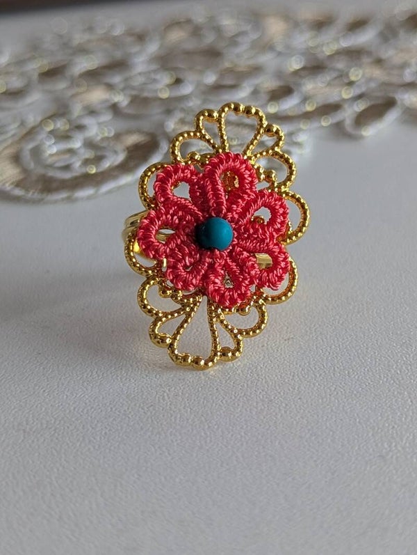 Bague en dentelle frivolité. Soie rayonne Altin bazak couleur corail. Perle tchèque turquoise clair. Bague métal inoxydable doré sans nickel.